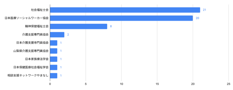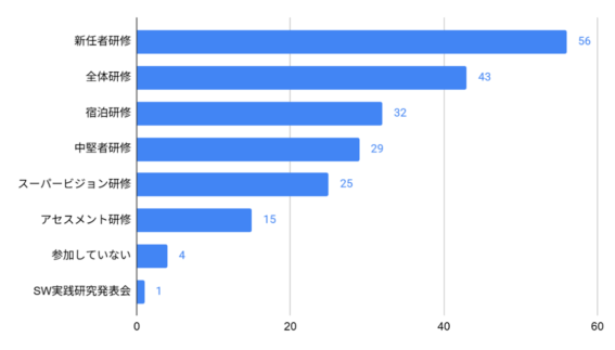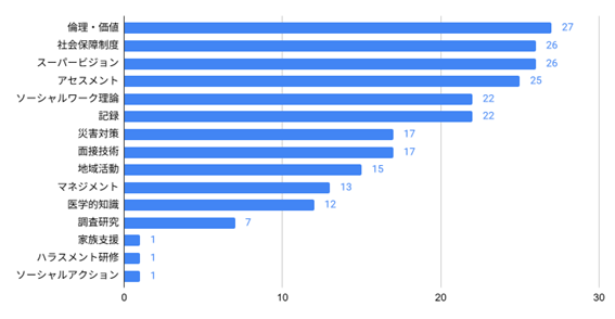 一方で、今後参加したい研修内容としては、「アセスメント」「スーパービジョン」「記録」「倫理・価値」「ソーシャルワーク理論」「面接技術」などが多く挙げられました。これらはいずれも、日々の実践に直結するテーマであり、専門職としての判断や関わりをあらためて振り返り、整理したいという意向の表れと受け止められます。