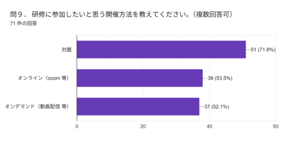 自由記述では、「毎年同じ研修では新鮮味を感じにくい」「参加者が固定化している」「新人が基礎を学べる場が少ない」といった課題も指摘されています。これらは研修内容のみならず、研修の目的や対象、位置づけを明確にしていく必要性を示す意見と受け止めています。
